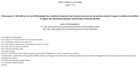 L’ordonnance n°2020-386, « adaptant les conditions d’exercice des missions des services de santé au travail à l’urgence sanitaire et modifiant le régime des demandes préalables d’autorisation d’activité partielle »…