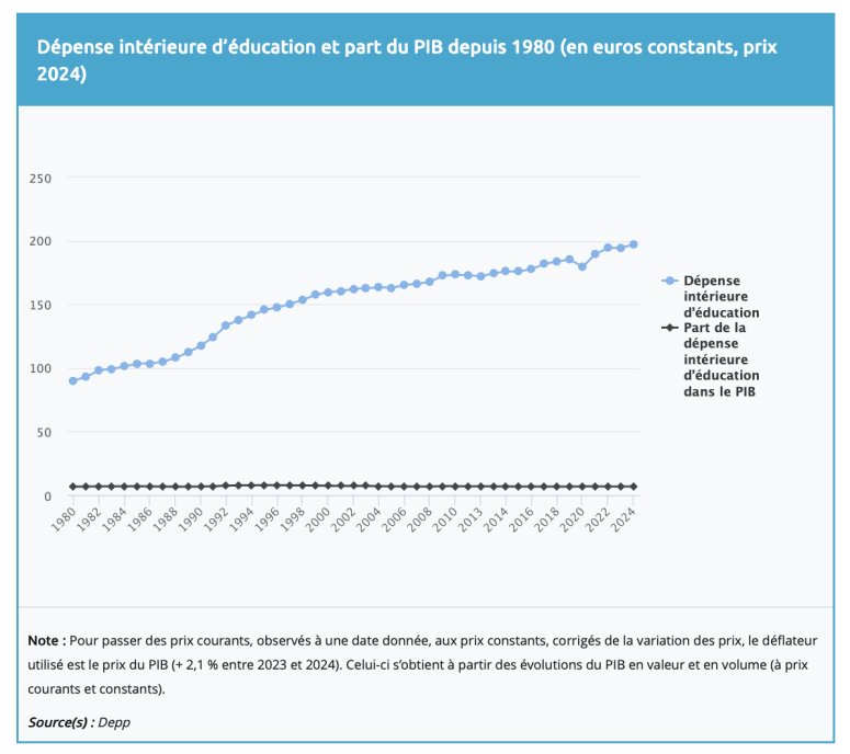 Dépense intérieure d’éducation : 6,8 % du PIB en 2024 ; 10 920 € par élève, 11 660 € par étudiant (Depp)