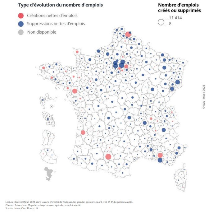 Créations et suppressions d’emplois salariés dans les grandes entreprises par zone d’emploi entre 2012 et 2022